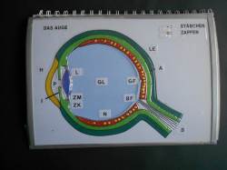 Schlagworte: Stäbchen; Zäpfchen; Hornhaut; Iris; Regenbogenhaut; Pupille; Ziliarkörper; Ziliarmuskel; Linse; Glaskörper; gelber; blinder; Fleck; Makula; Papille; Lederhaut; Aderhaut; Aehnerv; Netzhaut